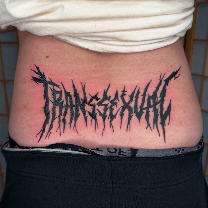 and i got to wrap up this month with a very special ‘transsexual’ trampstamp in a metal font for my bro lio! i’ve tattooed them countless times now, but i’d say this is probably my favorite one. i may convince him to let me do a lil tour of all his tattoos by me sometime soon…